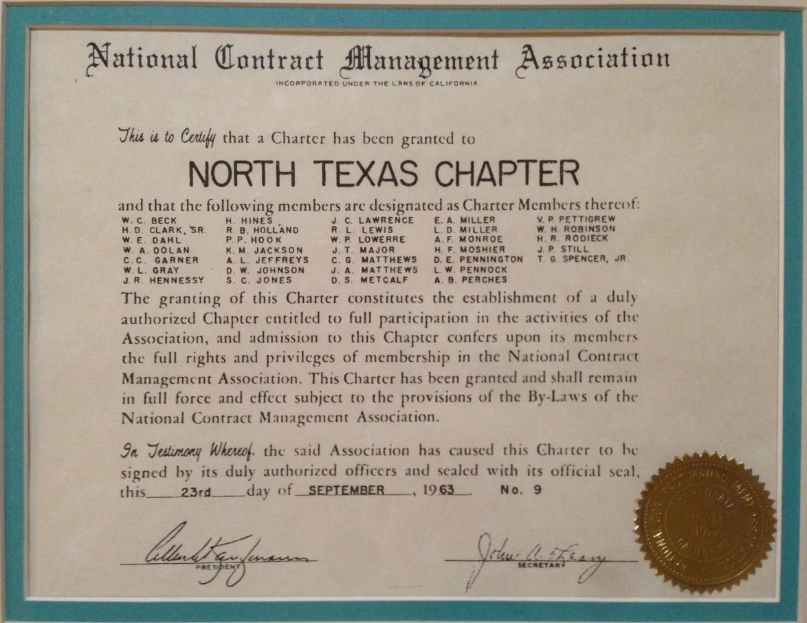 On September 23, 1963, the North Texas Chapter of the National Contract Management Association was officially chartered, establishing a legacy of excellence and leadership in contract management. Today, we proudly honor our founding charter members and recognize the commitment, vision, and tireless dedication of our past presidents. Their leadership has shaped our chapter, empowering professionals and strengthening our community through decades of growth and achievement. We extend our deepest gratitude to these visionary leaders who have paved the way for our ongoing success.